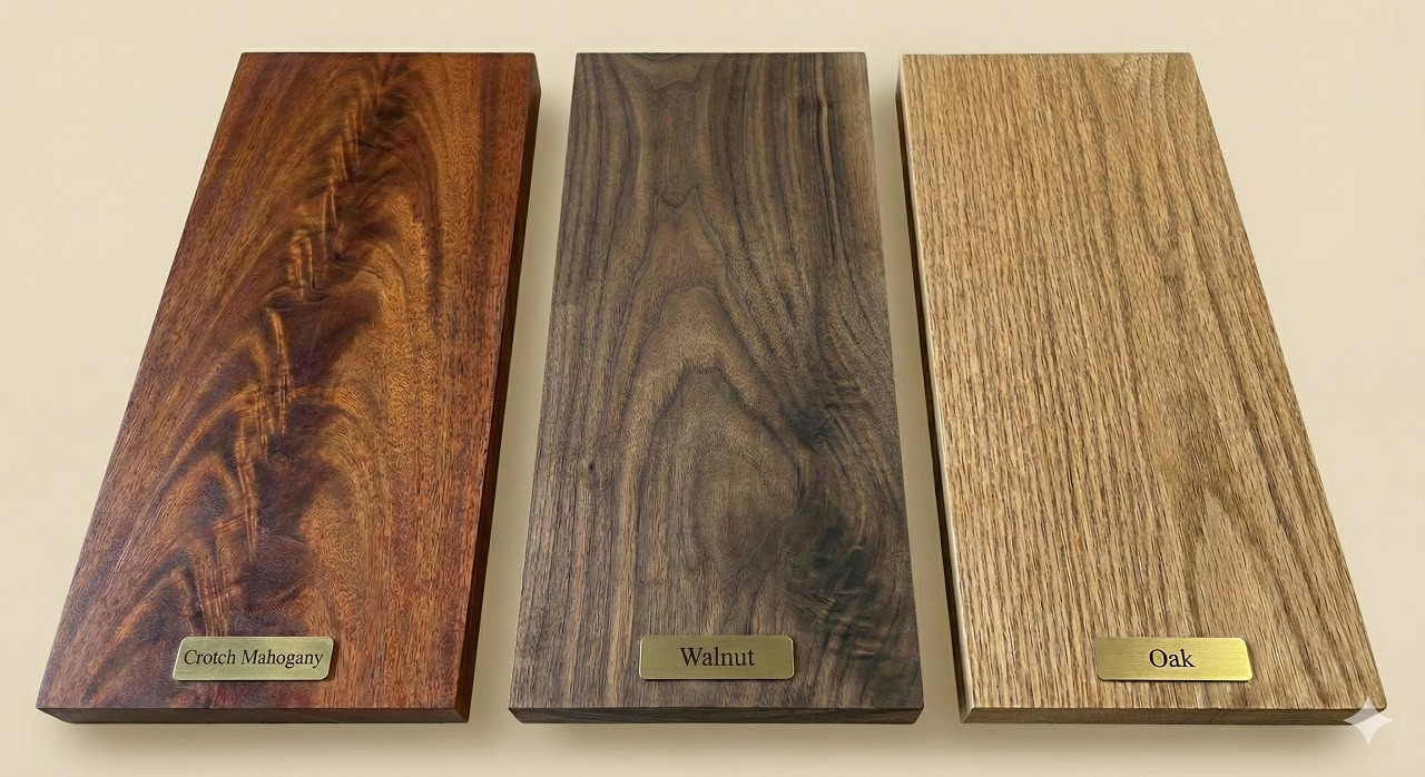 マホガニー:赤褐色の深い色合いが特徴。経年変化で美しい艶が増し、「家具の女王」と称される最高級材。