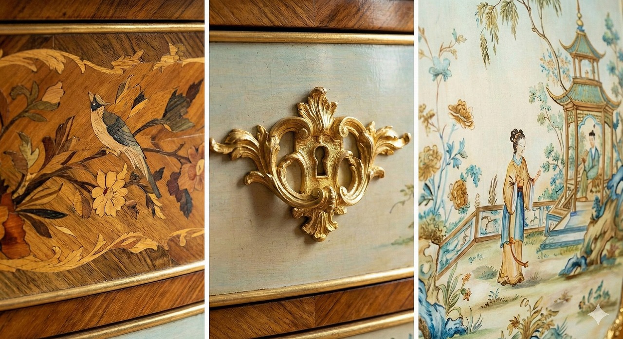 17〜18世紀の欧州で流行した、東洋の美意識を取り入れた装飾スタイルです。ハンドペイント、金箔装飾、花鳥風月のモチーフが特徴で、東洋の漆器に由来する伝統技法が用いられます。