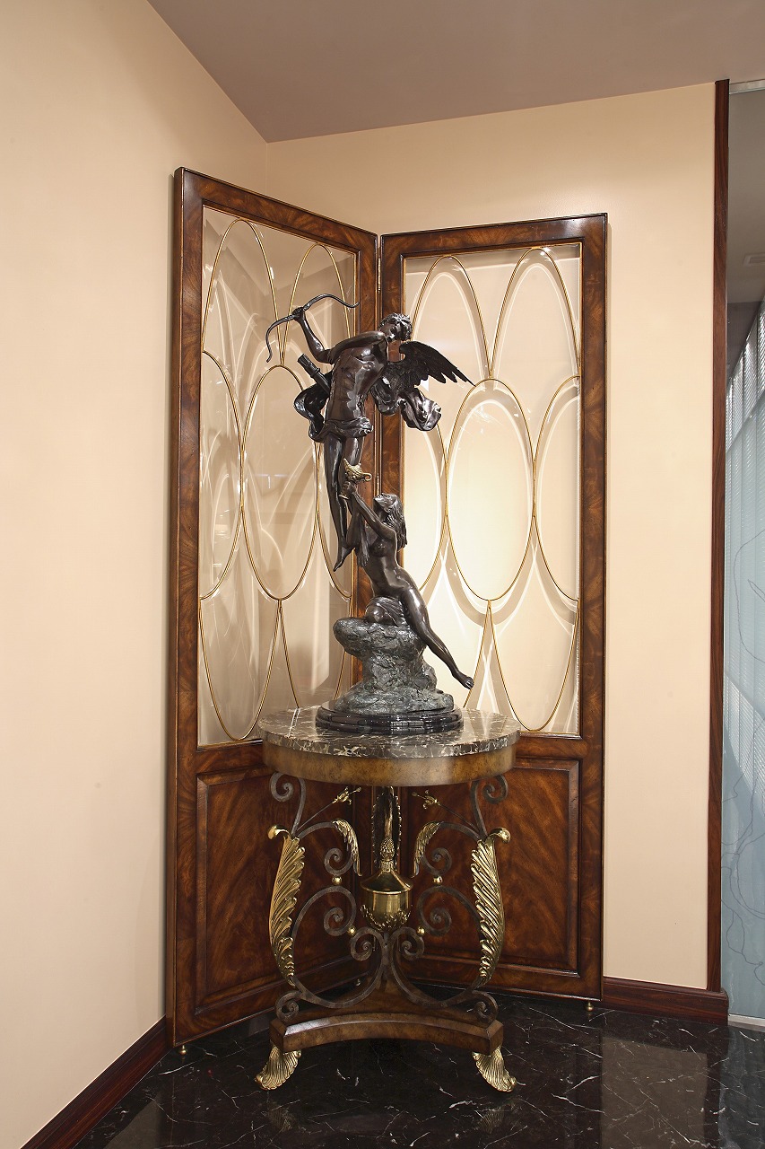 ドアを開けると、まず目に入るのは、セオドア アレキサンダーの2Pスクリーン。その前に、メートランドスミスの大理石トップのオケージョナルテーブルとブロンズオブジェを配し、高級インテリアの"顔"となる風格あるラウンジ空間を演出しています。