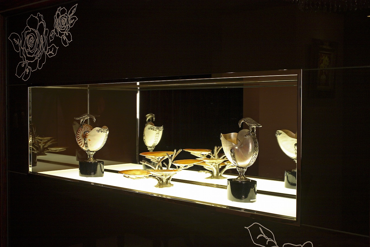 さらにガラスの扉を開くと、マーブルトップのカウンターにメートランドスミスのアームチェアを配置。チェアの対面のコレクションボードには、ヴァヌーチコレクションのシルバーアクセサリーをディスプレイしました。