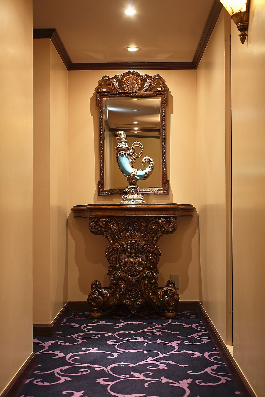 オーバル型のクリスタルシャンデリアのきらめきと相まって、VIPルームへと続く特別な空間への期待感を静かに高めていきます。