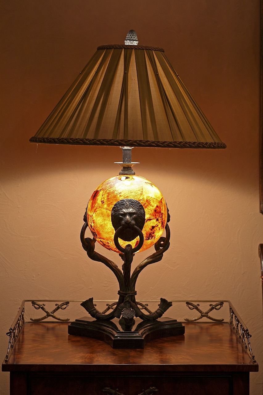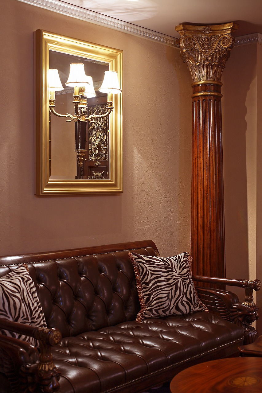 壁面のミラーやウォールパネル、コーナーに配置したコラムが空間に奥行きを与え、重厚な色調の中に格調ある雰囲気をつくり出しています。また、センターテーブルと調和するソファや、ライオンマスクのシェルボディを照らすランプを配することで、空間全体の色味のバランスを整えました。