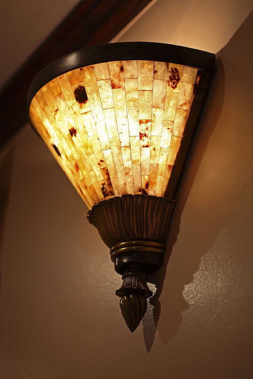 なお、アイアンのゲートはメートランドスミスの4Pスクリーンを改良して制作したものです。一部は壁面スリットとして用い、空間にリズムを与えています。さらにシェルモチーフのランプやウォールランプのデザインを統一し、ゴールドフレームのミラーと組み合わせることで、光の反射を生かした奥行きある空間を演出しました。