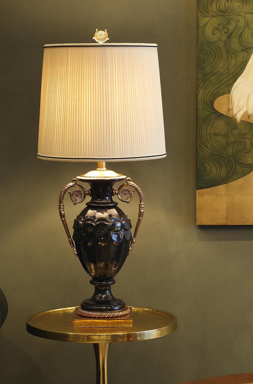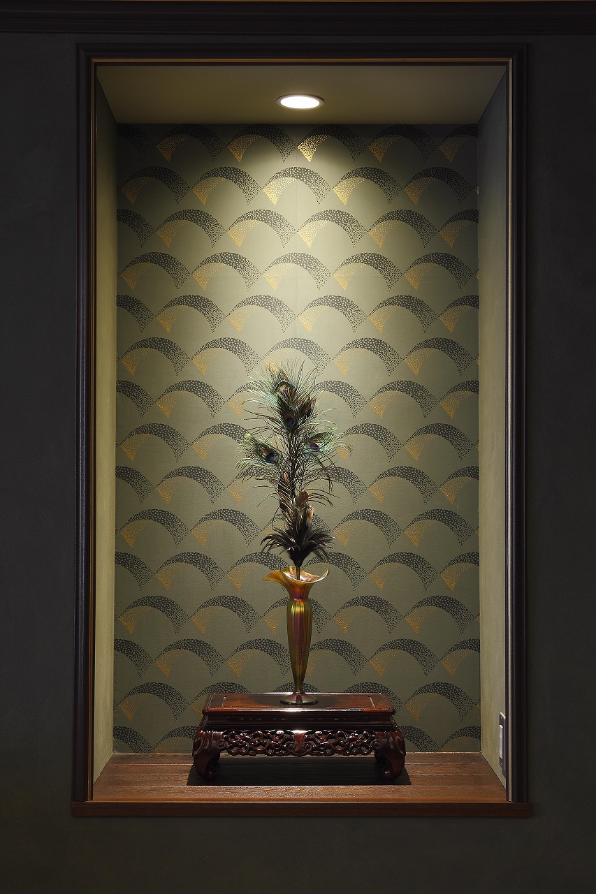 鶴のパネルの反対側の壁面にはニッチスペースが設けられ、小さな円窓障子の下には、紫檀に天然石や貝をはめ込んだ唐木のアンティークテーブルが置かれ、その上には猫のオブジェが配されています。コーナーにはクラシック家具のトーシャとアールデコ調のランプを組み合わせ、空間全体の統一感を演出しています。もう一つのニッチには唐木の花台をしつらえ、花瓶と植栽を配置することで、和モダンインテリアならではの文化の融合を図った設えになっています。
