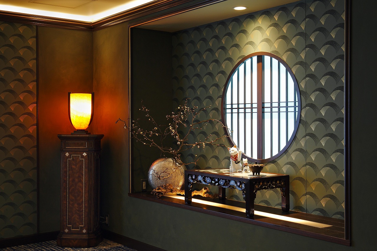 本空間は、和モダンインテリアと西洋文化が融合する安土桃山時代へのオマージュとして、弊社がデザインしました。和洋折衷インテリアの真髄を、異なる文化がマーブルのように交じり合うリミックス・インテリアとして表現しています。