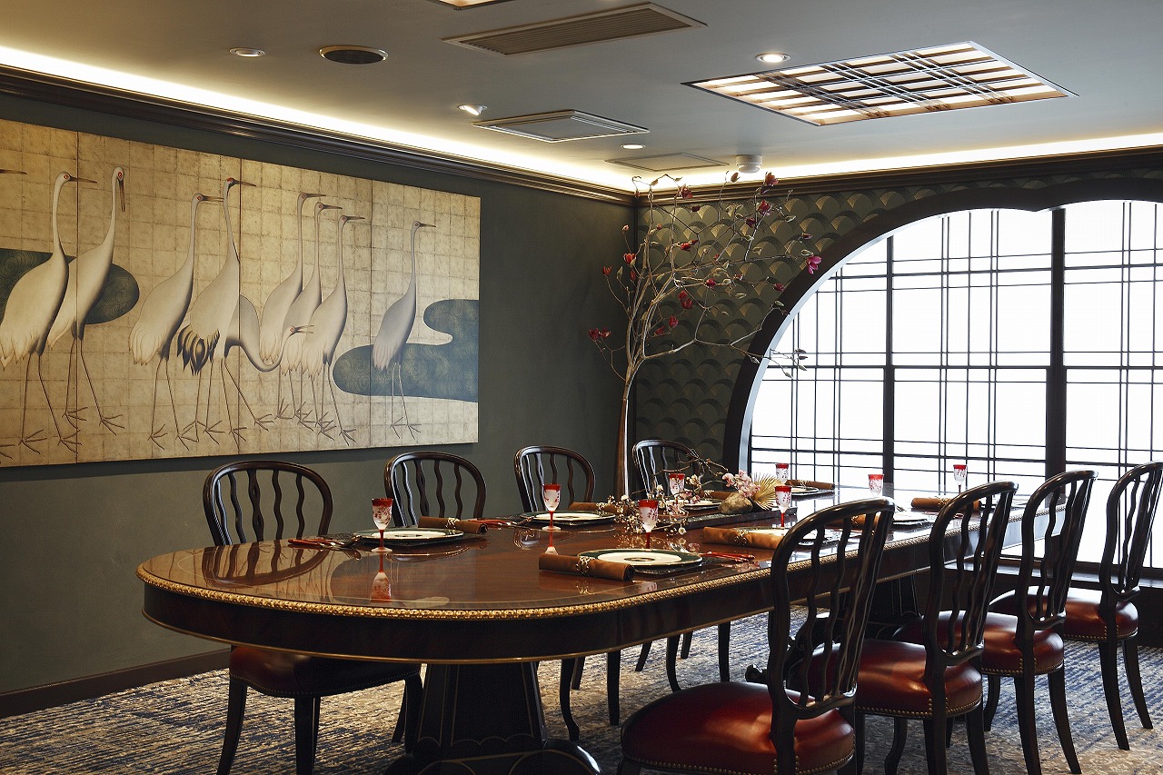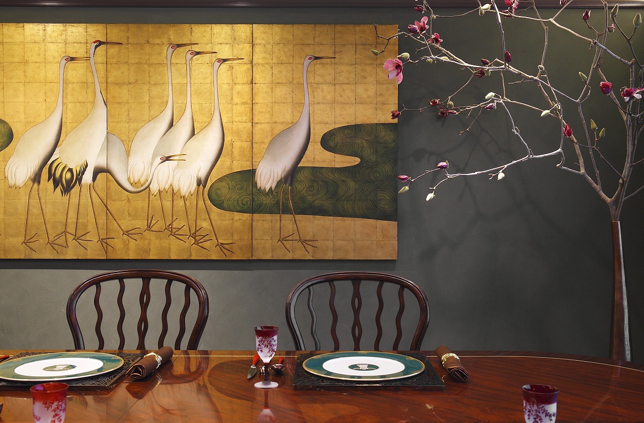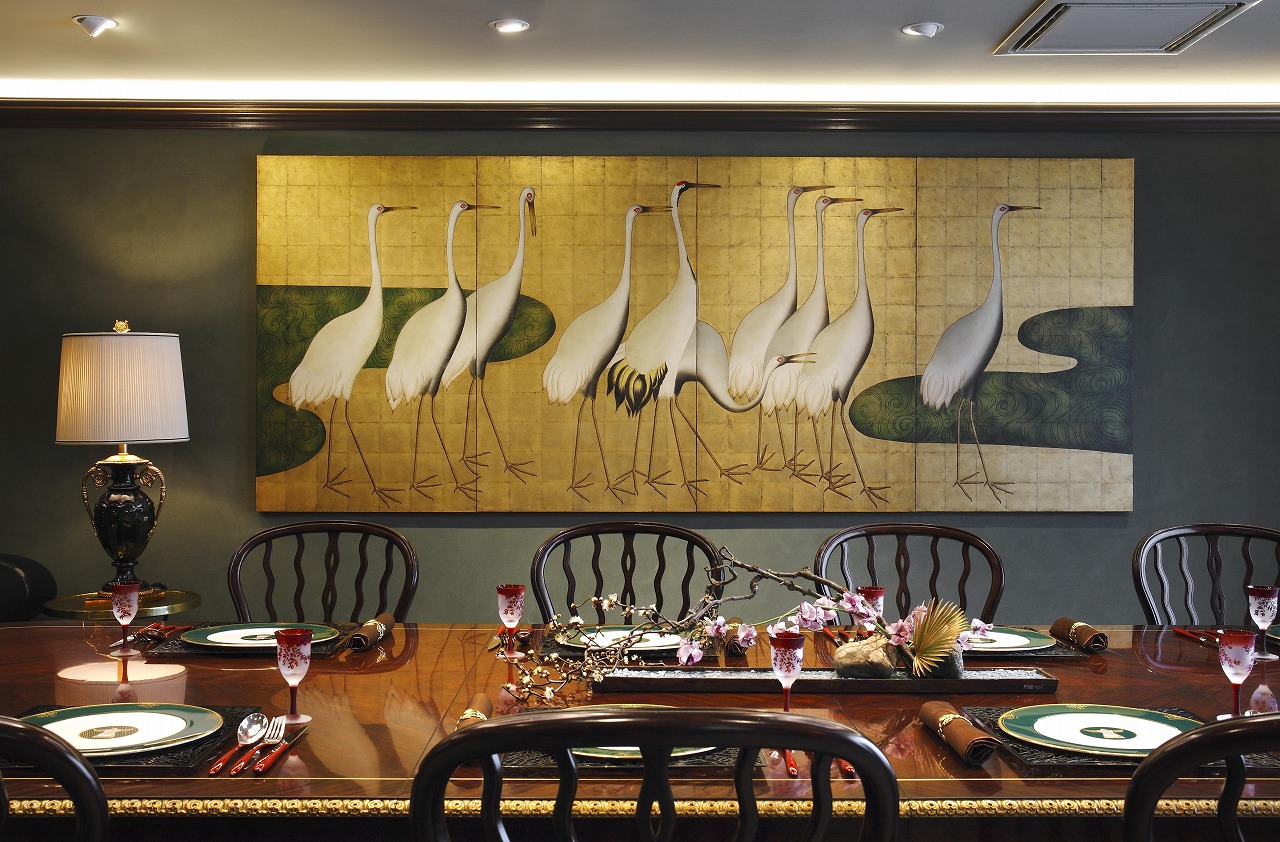和モダンリビングの趣を感じさせる織部の深緑の色と壁紙が、空間に落ち着きと力感を与え、リビングの横にはイギリス人デザイナー、スティーブン・チャーチによるクラシックインテリアのダイニングテーブルとオルソープのセドンチェアを組み合わせました。その壁面には迫力ある鶴のゴールドパネル四枚を配し、円窓障子とクラシック家具の融合により空間全体の調和を演出。和洋折衷インテリアの魅力を感じていただける設えになっています。