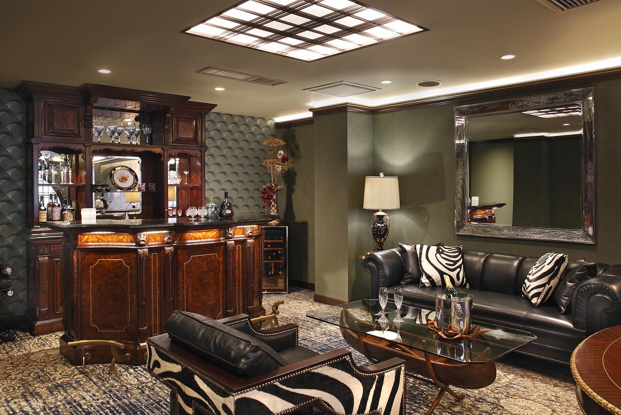 扉を開けると、ゼブラ革のクッションを添えた黒のチェスターフィールドソファとラウンジチェアが迎え、エントランスとは異なる現代的な要素を取り入れた高級インテリアのリビング空間が広がります。そのかたわらには、和モダン家具の風格を持つマーブルトップのマホガニー製バーカウンターとバックバーが配され、訪れる方々のファーストインプレッションを強く惹きつけます。