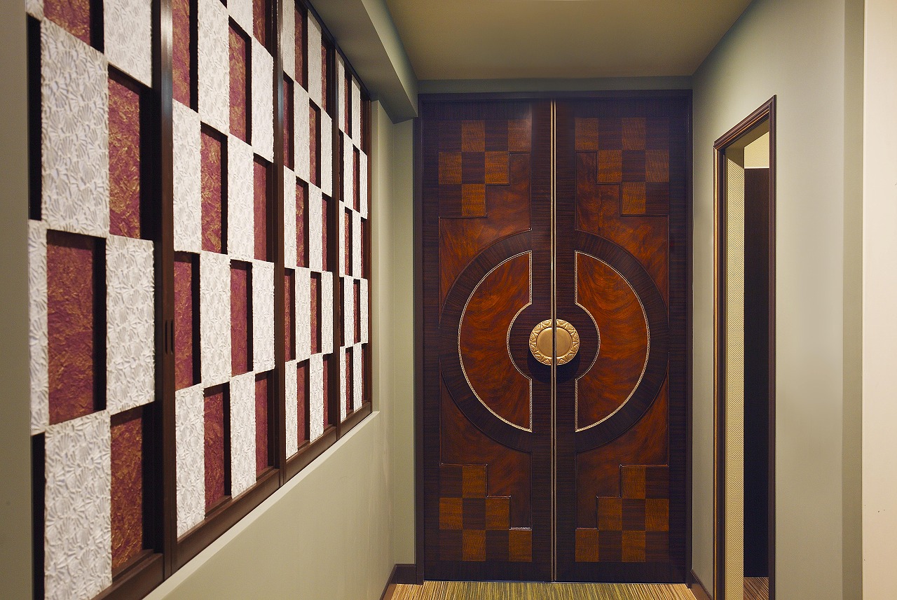 正面の重厚なドアは、日本古来の木工技術と南蛮文化のシンメトリー美学を融合させ、直線的な寄木細工の中に中央の円のモチーフを大胆に描くことで、和洋折衷インテリアの新たな世界を象徴。中央の黄金のメダリオンが、遠き異国からの工芸品のような気品を添え、エントランス全体の主役として存在感を放っています。