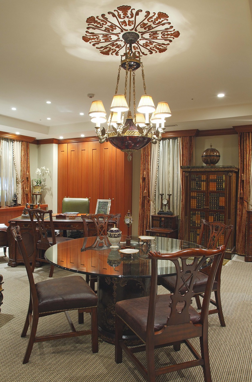 そこに、シノワズリのダイニングテーブルセットやウォールランプを加え、オフィスインテリアの象徴としてメートランドスミスのパートナーズデスクとデスクチェアを配置。アンティークシャンデリアには、ネオクラシック様式のスワンモチーフにシェルシェードを組み合わせたデザインを採用しました。