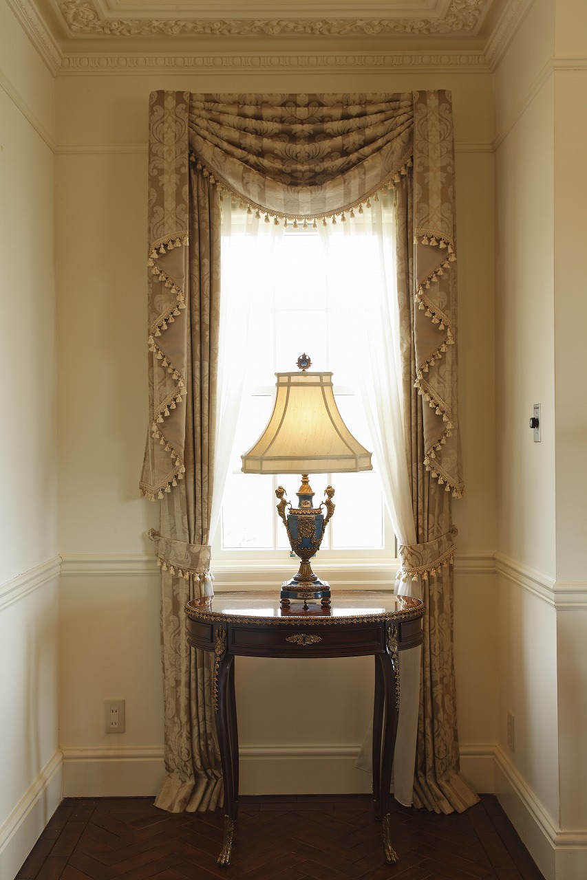 マントルピースの両サイドには、メートランドスミス社の曲線的な脚を持つオケージョナルテーブルをシンメトリーに配置。その上には、片方にターコイズブルーのテーブルランプ、もう片方にはハンドペイントが施されたアンティーク調のジャーを置き、窓辺のデザインカーテンと共に、クラシック インテリアにさりげないアクセントを添えています。