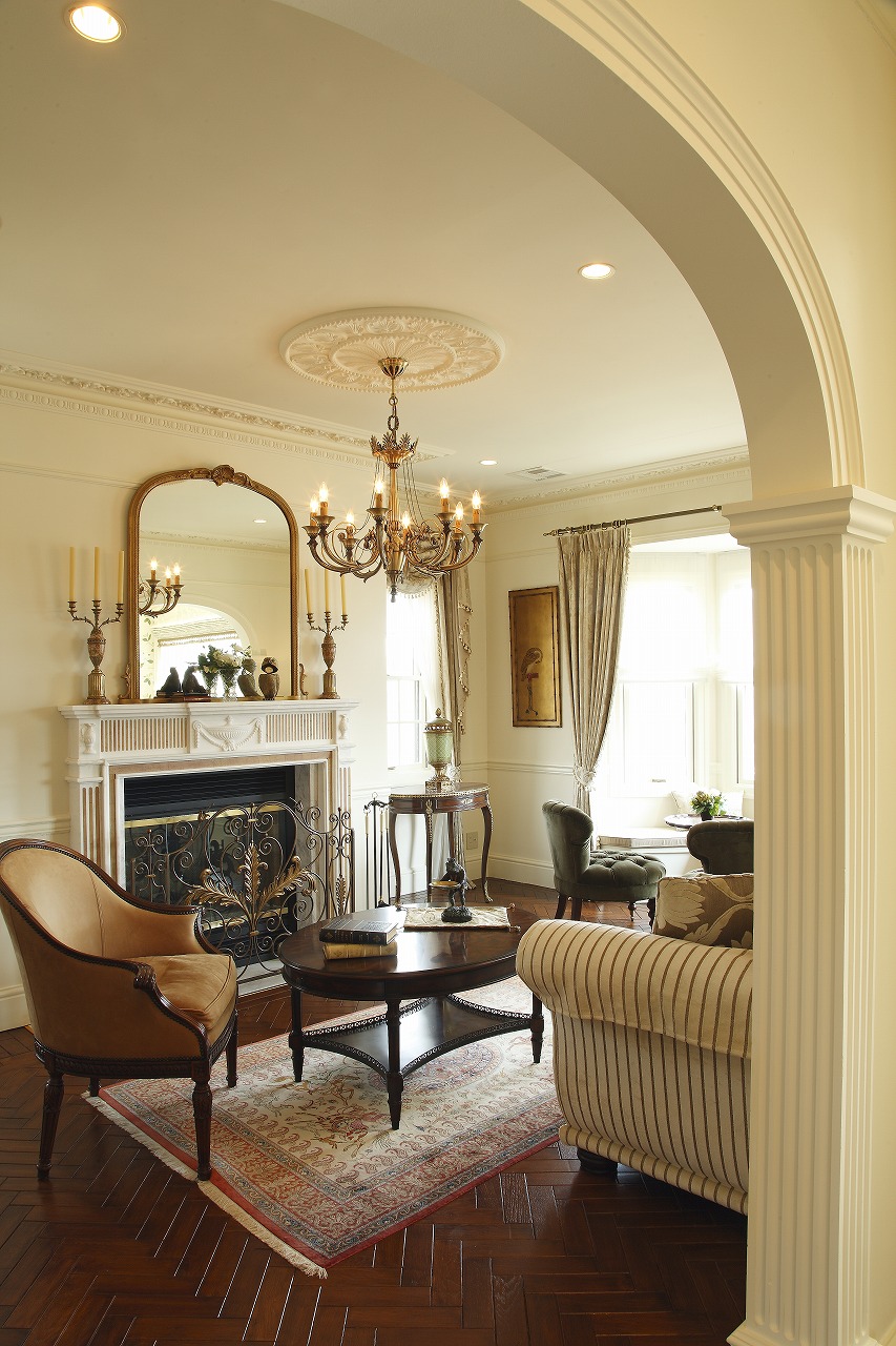 階段を上がり2階に進むと、アーチの奥にマントルピースを中心としたヨーロピアン クラシック インテリアのリビング空間が広がります。
