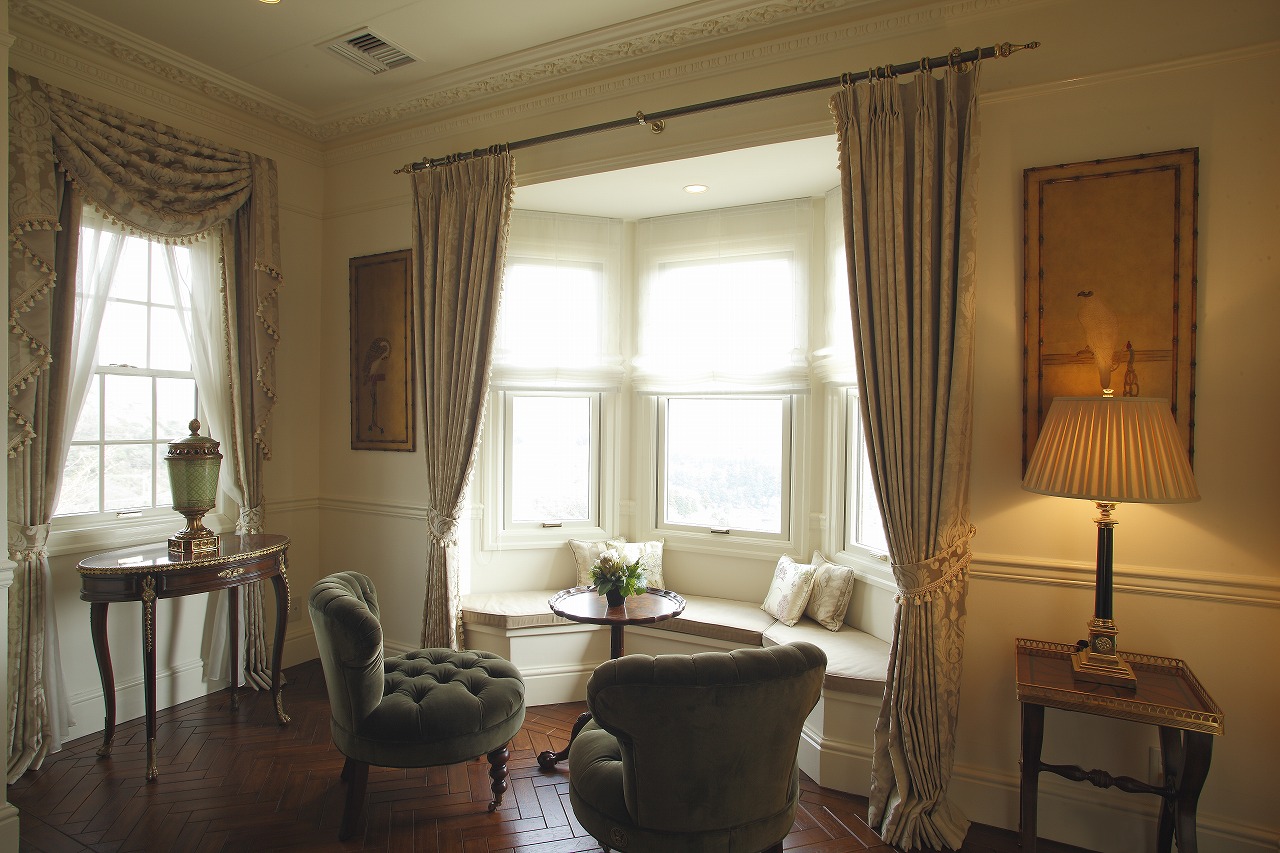 リビング奥の窓辺には、備え付けのベンチに合わせてオルソープのナーシングチェアとティーテーブルを配置。芦ノ湖の景色を一望しながら、ゆったりとくつろげるスペースとなっています。
