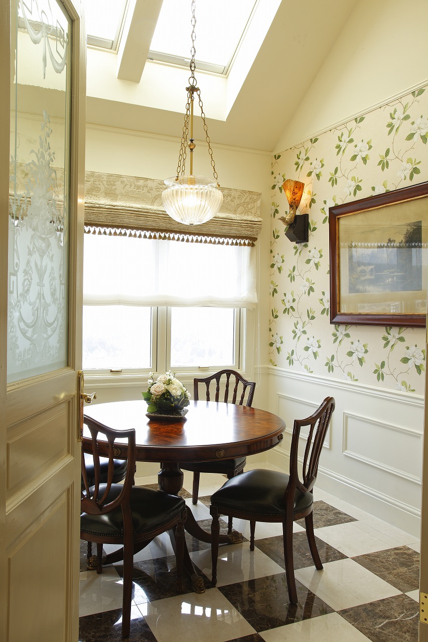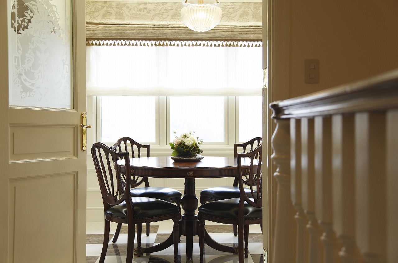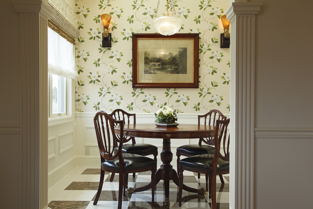 天井にはケーシングやモールディング、メダリオンが施され、壁面にもケーシングをあしらうなど、本格的な英国インテリアの内装が英国家具や調度品の存在感をさらに引き立てています。