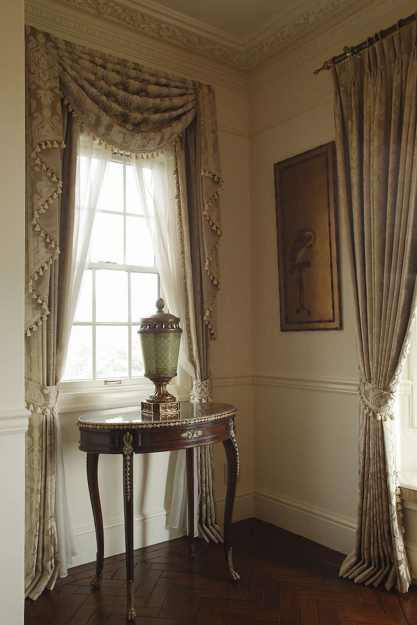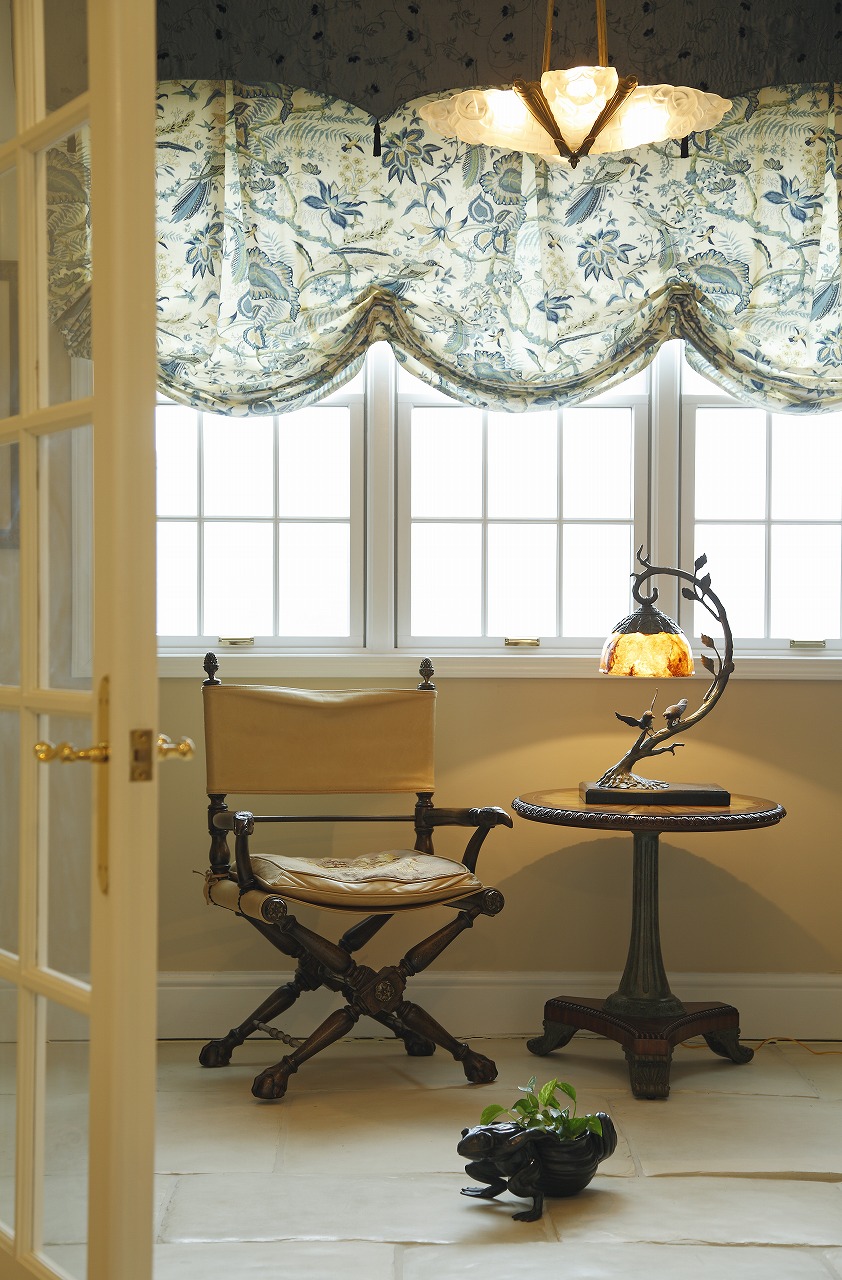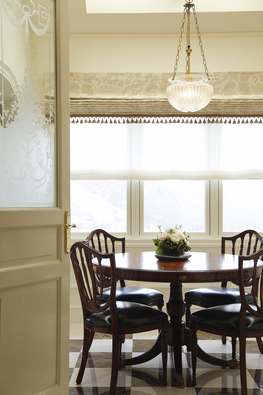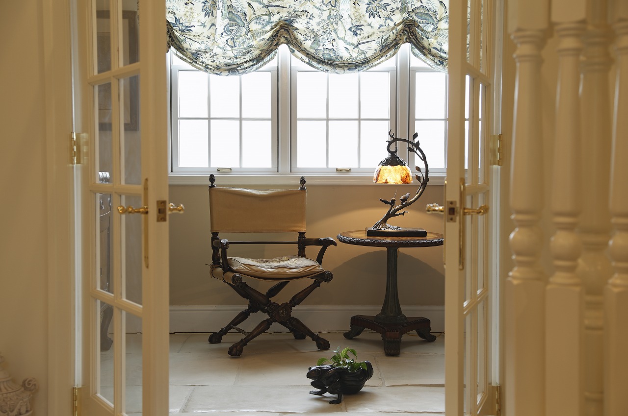天井にはケーシングやモールディング、メダリオンが施され、壁面にもケーシングをあしらうなど、本格的な英国インテリアの内装が英国家具や調度品の存在感をさらに引き立てています。