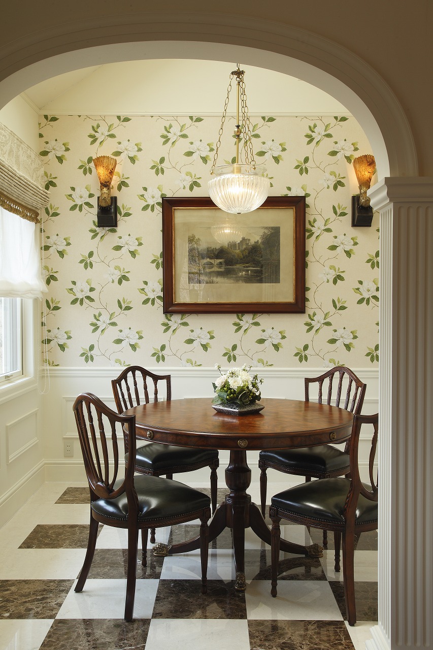 リビングルームから連なる新たなアーチの先には、淡いクリーム色の地に、白い花とグリーンの葉をあしらった壁紙をフォーカルポイントとするダイニングルームが広がります。