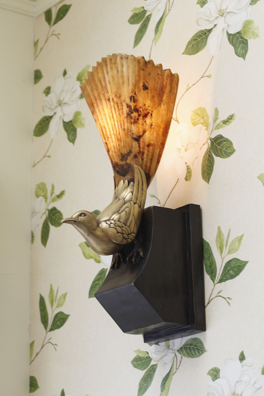 メートランドスミスのランドスケープのリトグラフと、鳥をモチーフにしたウォールランプが配され、クラシック インテリアに物語性のある表情を添えています。