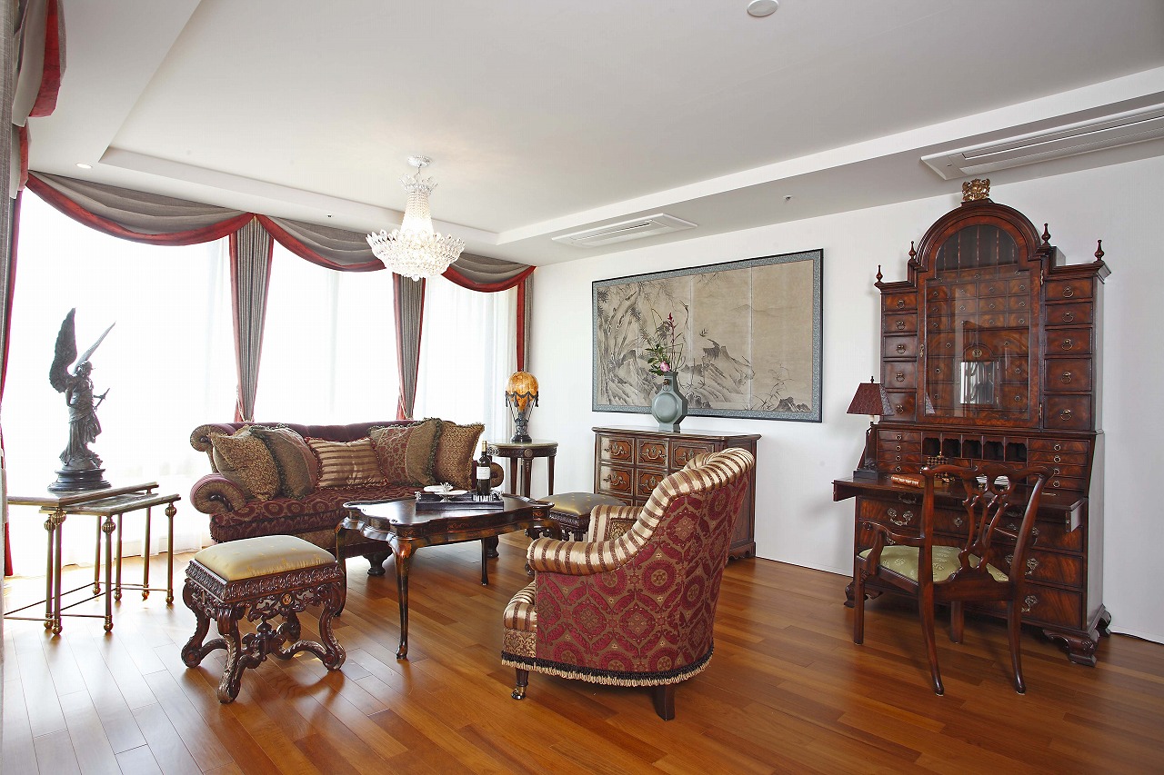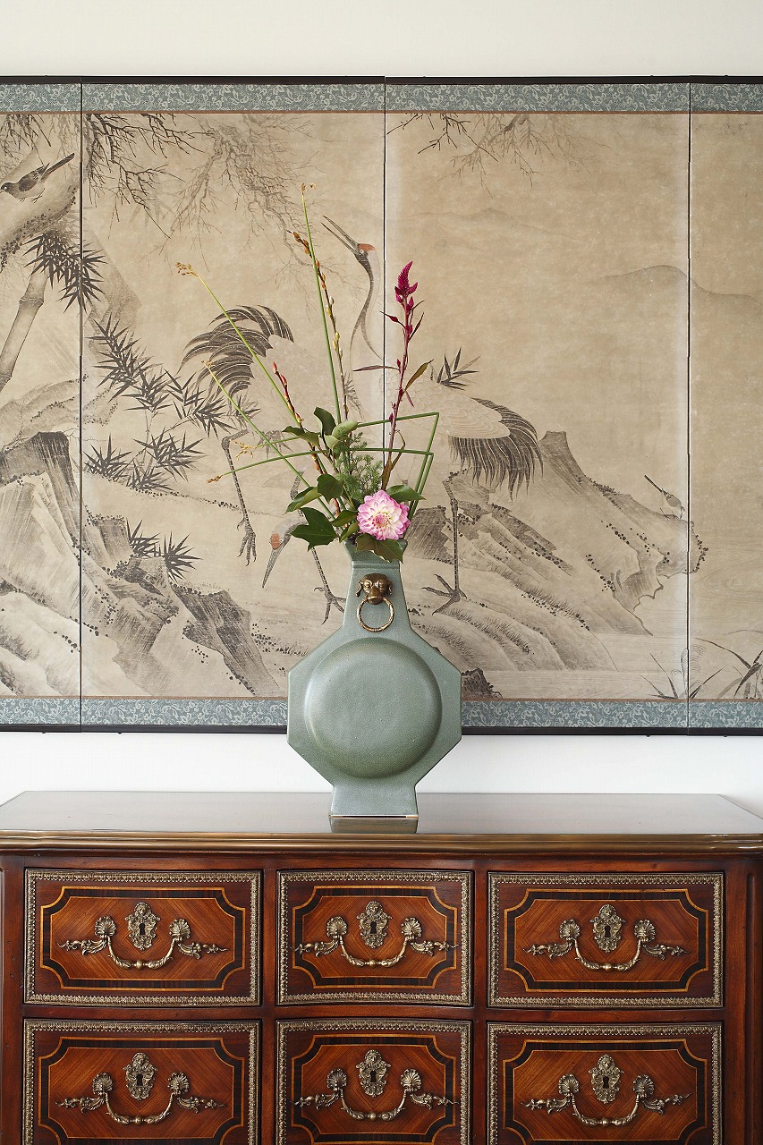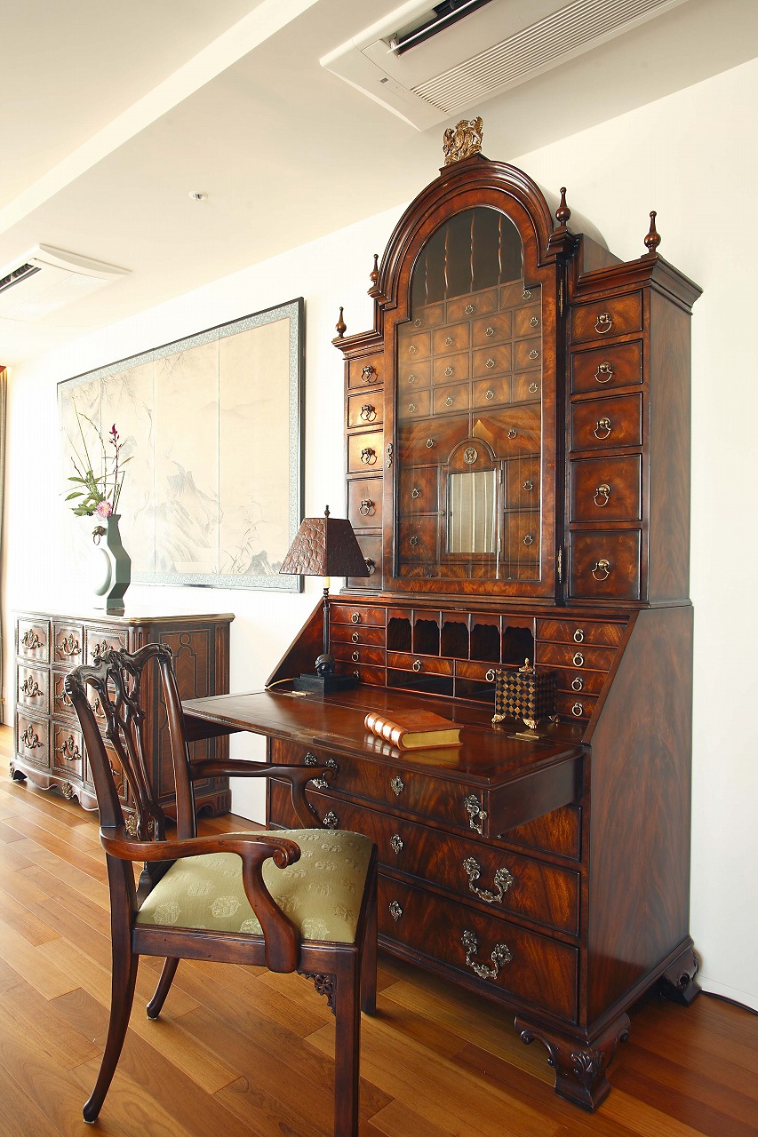 さらに、オルソープのチェストの背後には、六扇の花鳥屏風を据え、その傍らにビューローキャビネットを配置。各ブランドの最高峰とも言えるアイテムをあえて一点一点際立たせることで、高級サロンならではの非日常性の高い空間構成を実現しています。
