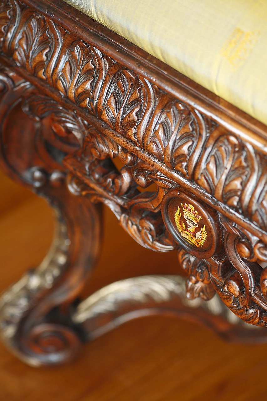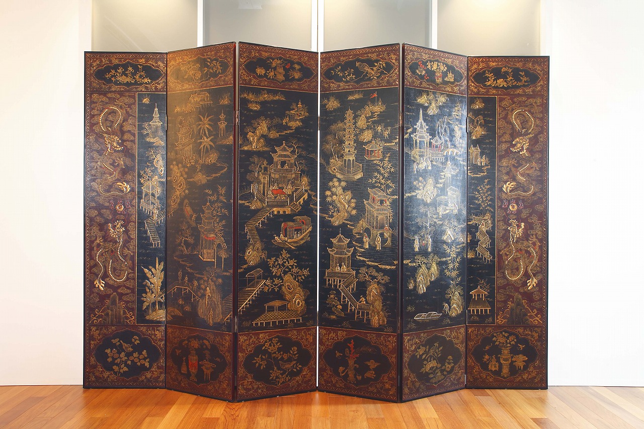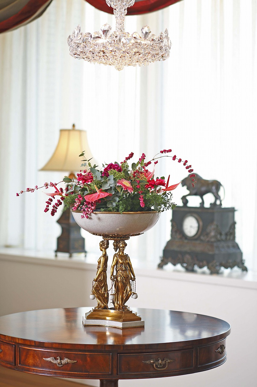 さらに、オルソープのチェストの背後には、六扇の花鳥屏風を据え、その傍らにビューローキャビネットを配置。各ブランドの最高峰とも言えるアイテムをあえて一点一点際立たせることで、高級サロンならではの非日常性の高い空間構成を実現しています。