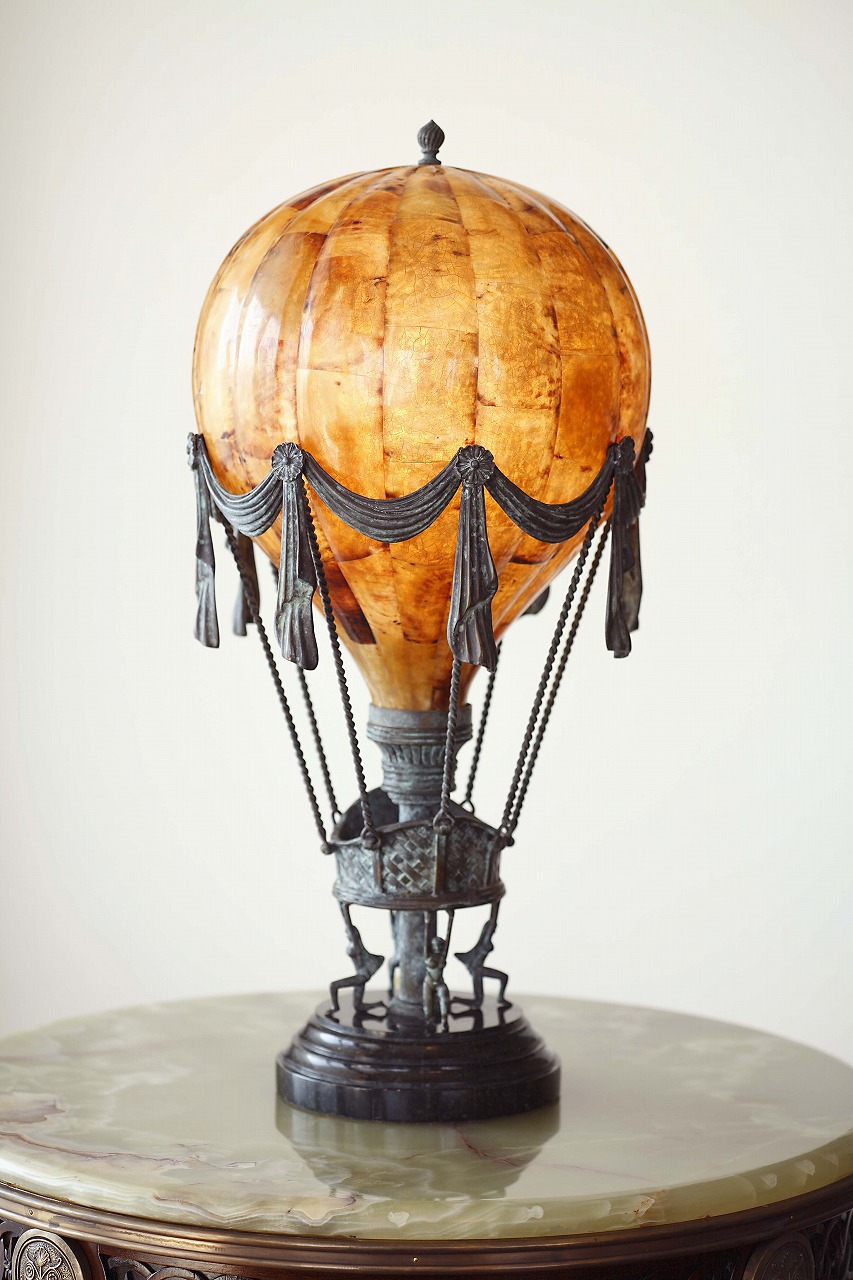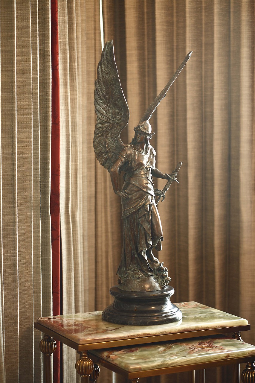 このサロンインテリアの核となるソファの傍らには、メートランドスミスのシノワズリのカクテルテーブルをはじめ、オニキスのランプテーブルとバルーンランプを組み合わせ、高級サロンに静かな華やぎを添えています。反対側には、同じくオニキスのネストテーブルにニケのブロンズ像を配し、素材と造形のコントラストを際立たせたサロン内装となっています。