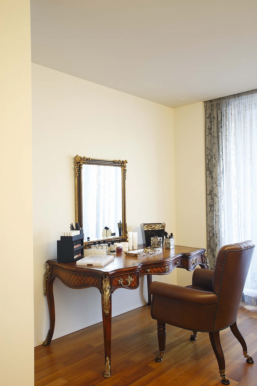 施術室は、一人ひとりに丁寧に向き合う高級サロンならではの設え。クラシックスタイルのデスクとミラーを合わせ、ゆったりとした施術台を中心に構成されたサロン内装は、過度な装飾を抑えながらも上質な存在感を放ちます。