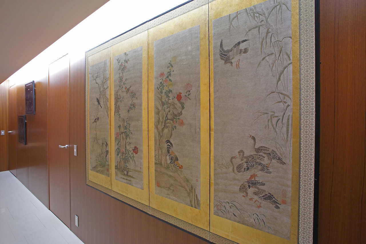 施術室へと続く廊下には、サロンインテリアに配された屏風よりも華やかな、金彩の花鳥柄の屏風を壁面にしつらえ、これから始まる高級エステのひとときへの期待感を静かに高めます。